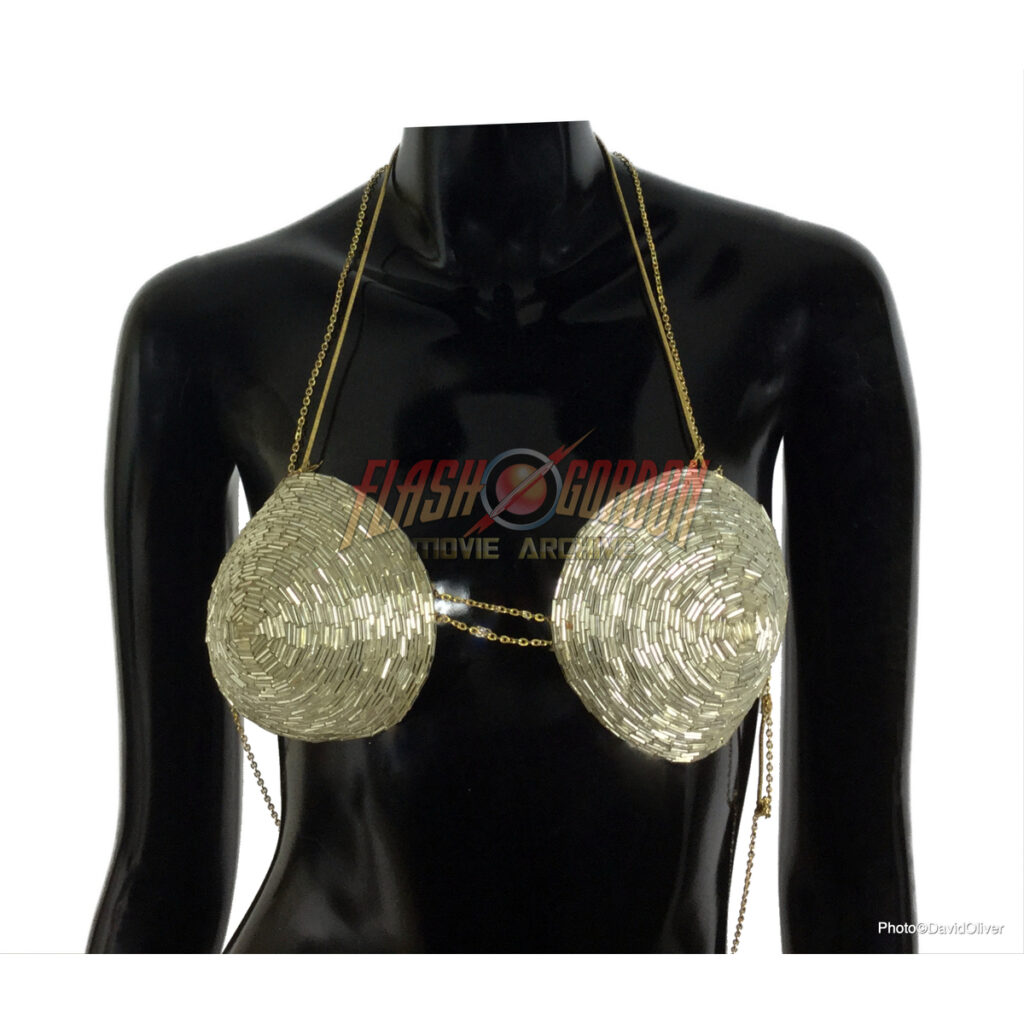 The bikini like garment is intricately covered in hand applied metallic sequin beads of a golden hue.